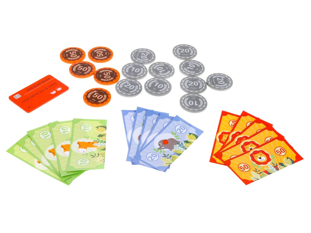 - cash register with an opening drawer, - abacus, - payment terminal, - barcode scanner, - 10 banknotes, - cash register roll, - credit card, - 15 coins. |