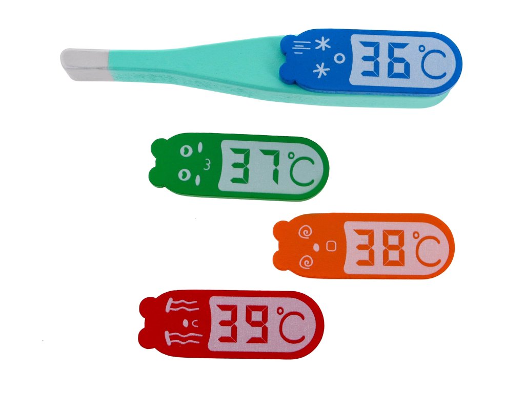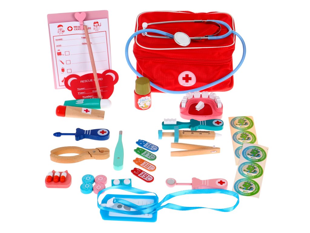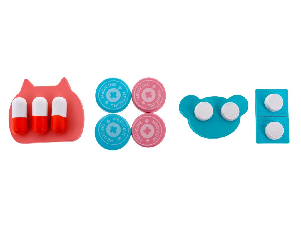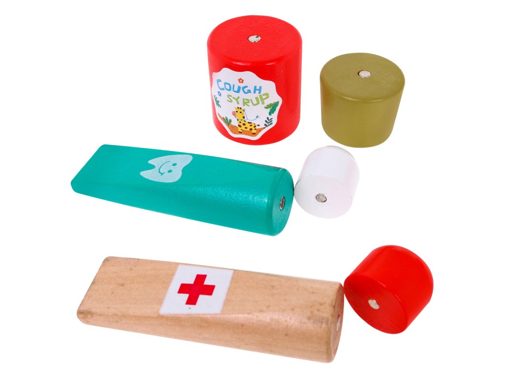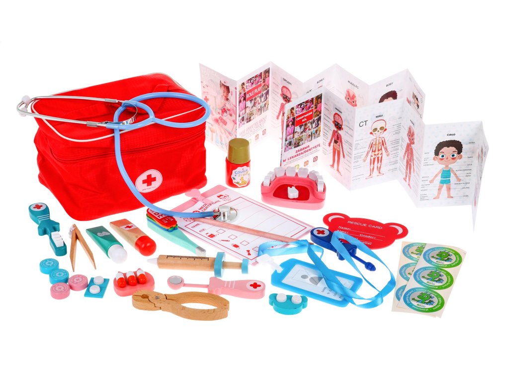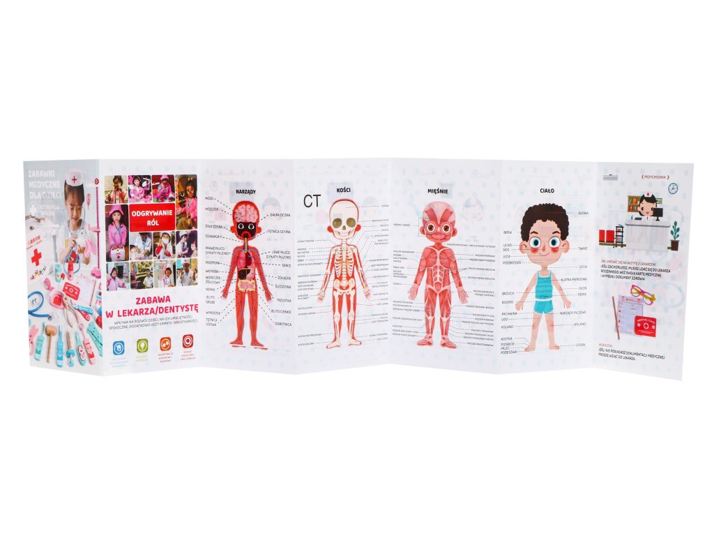 | - wooden movable syringe 13.5x4x2.5cm - wooden dental tweezers 12x4x1.5cm - metal stethoscope - wooden syrup with a detachable cap 7x4x4 cm -wooden imitation of the ointment 10x3x3cm - wooden toothpaste imitation 10x3x3cm - wooden thermometer with variable temperature indicators 12x3x1.5cm - wooden imitation of capsules 5x4.5x2cm - 4x wooden imitations of tablets 2.5x2.5x1.5cm - wooden imitation of tablets 4x2.5x0.5cm - wooden imitation of tablets 5x3x1 cm - wooden badge in the shape of a teddy bear 12x8x0.5cm - a plastic ID with a lanyard - wooden tweezers 10x1.5x1.5 cm - wooden base with replaceable cards with information about the patient's condition + pencil 18x13x0.5cm - wooden imitation of the jaw (10x7x2.5cm) with 9 wooden teeth (2x1.5x1cm) - wooden brush 13x3x2 cm - a wooden mirror with a handle 13x3x1.5cm - wooden dowel 12x3x1.5cm - 3x sticker "brave patient" in Polish 5x5cm - 3x sticker "brave patient" in English 5x5cm - material suitcase closed with a zipper 22x14x15cm - a book in Polish and English teaching children how to build a human body (organs, bones, muscles, body) - a booklet in Polish and English, teaching children how to behave with given doctors together with instructions |