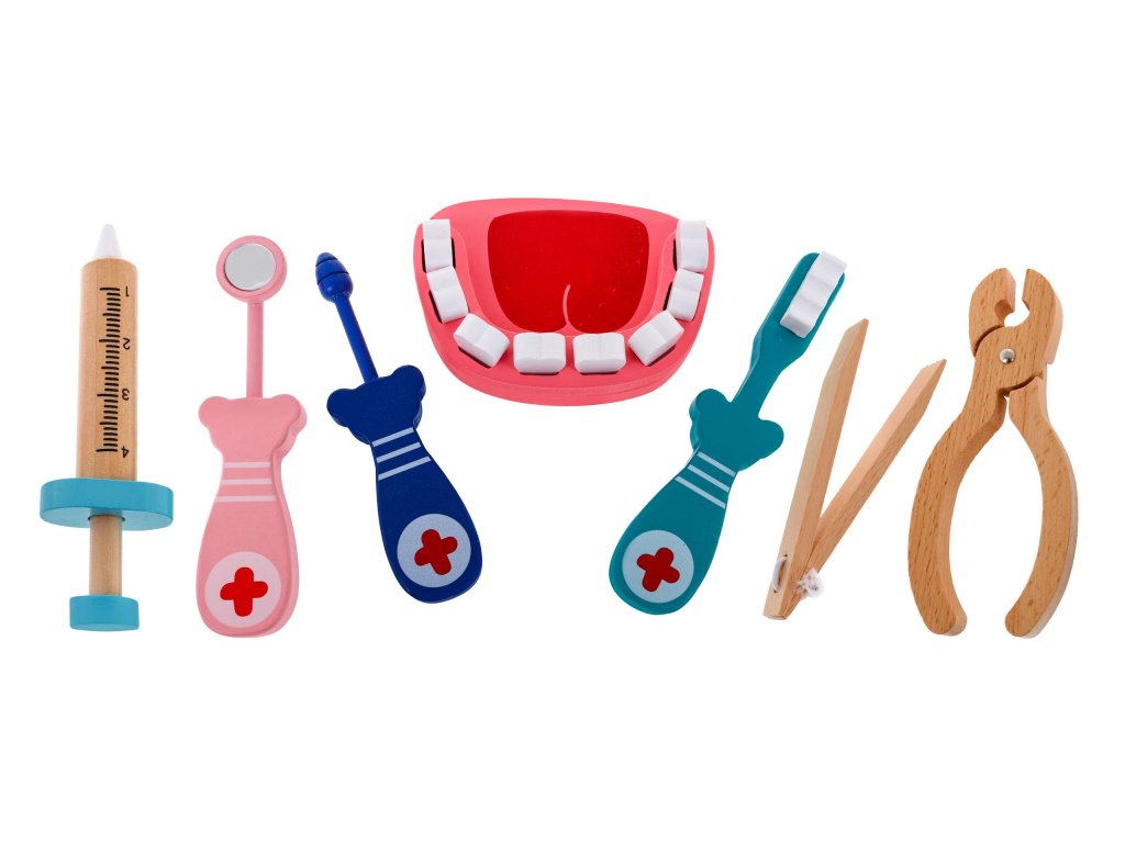 | The wooden dentist's set is an excellent educational toy that develops the manual dexterity of our child. It is a fantastic set for a young student over 3 years old. Rich, 24-element equipment gives unlimited possibilities in the treatment of small patients. The individual elements of the set are imitations of real medical instruments, which have been given friendly shapes and vivid colors. The items collected in the set will provide our children with a lot of joy in treating their loved ones, and at the same time they will endure the fear of a real doctor through play. The colorful form of medical instruments make them more friendly to our little ones. The whole set will surely delight your child. A handy material packaging "suitcase" is packed, perfect for a gift. The kit does not require additional batteries. |