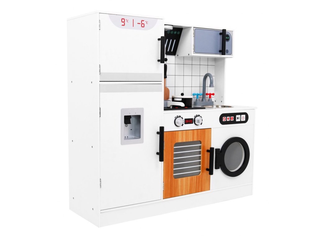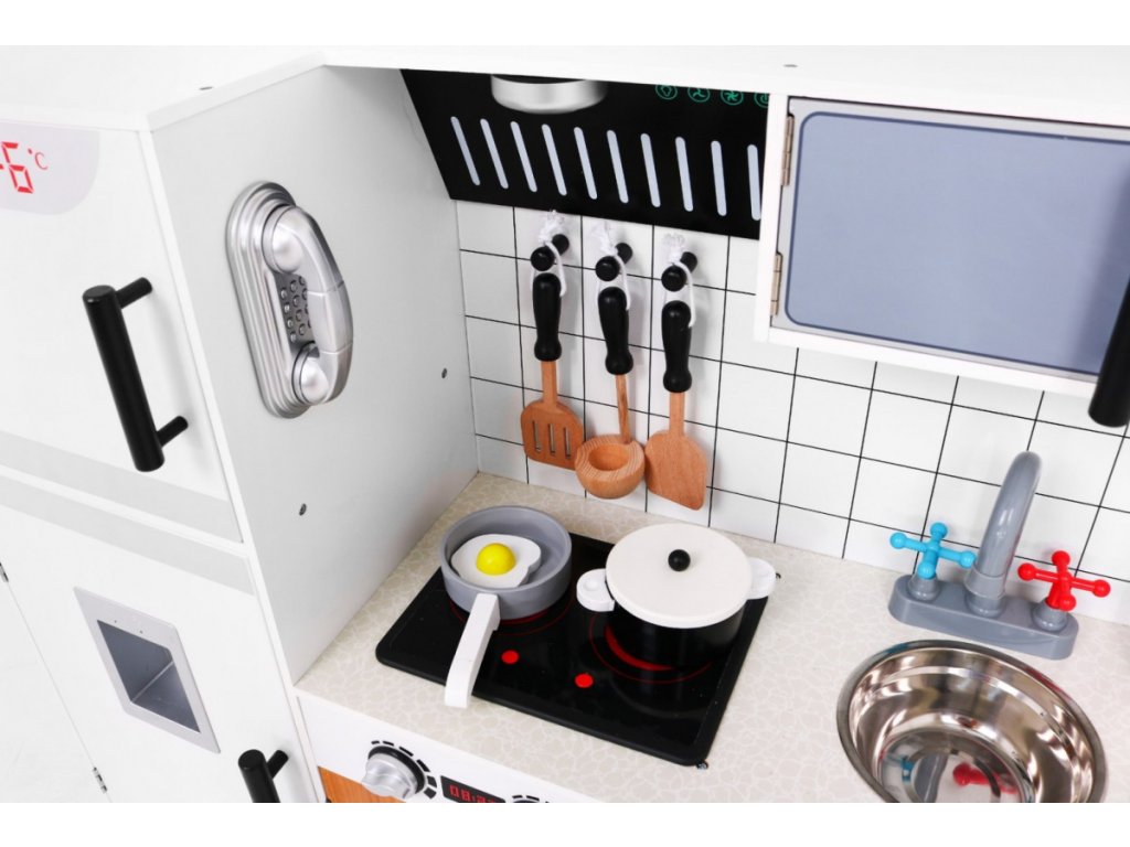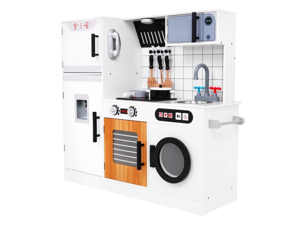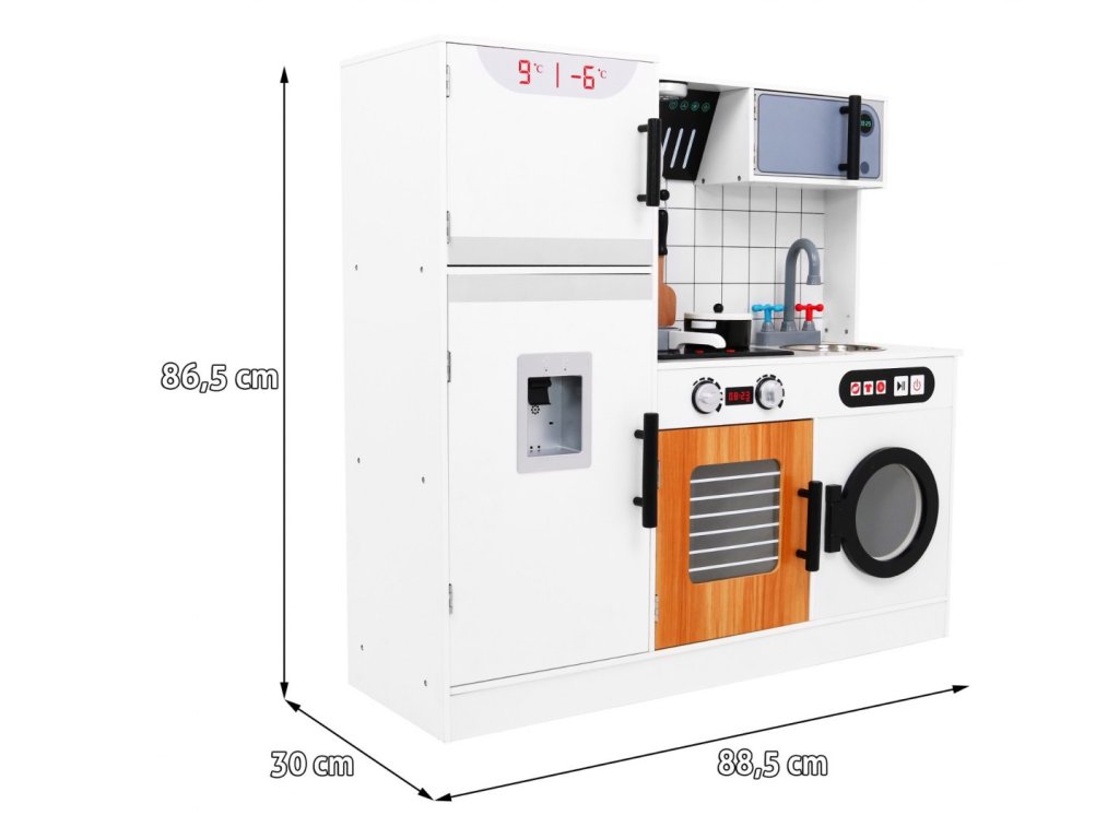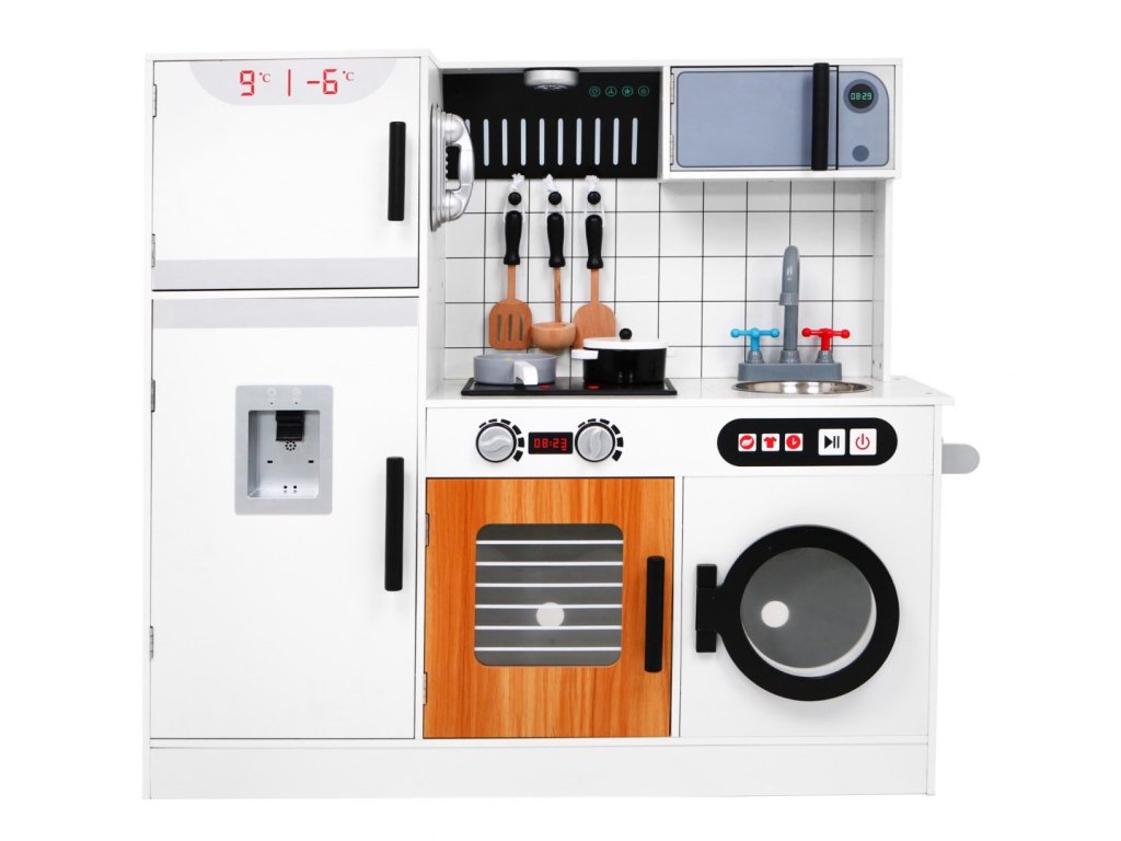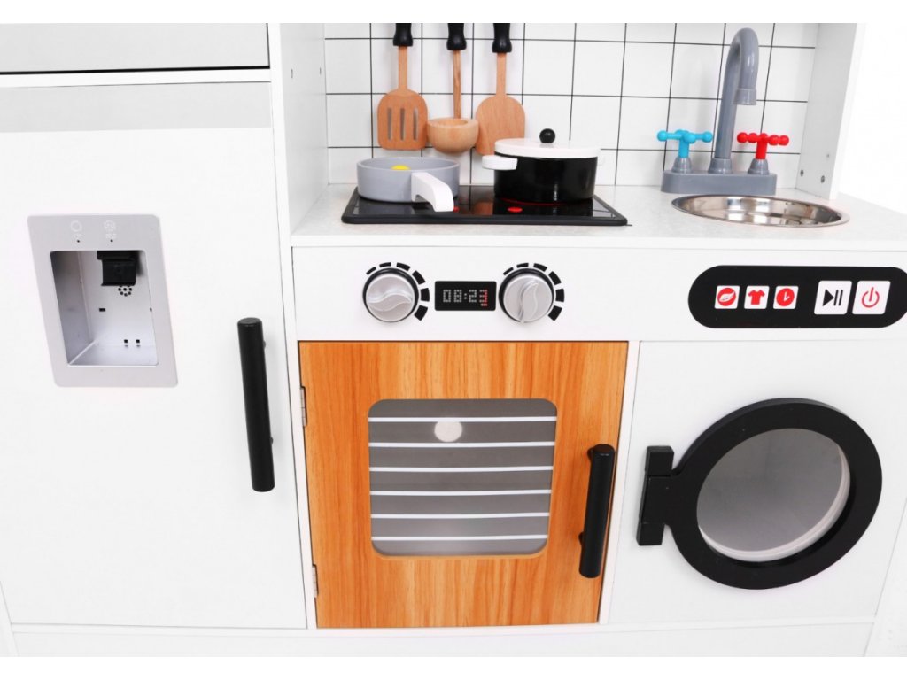 | A wooden kitchen with equipment is a proposal for children from 3 years of age. Exquisitely made, richly equipped, it will appeal to your child. The proposed kitchen is made of high-quality wood, solid and durable material, it is stable and resistant to external damage. It looks like a real kitchen, which is very important for your child. The wooden kitchen and its wooden fittings have been painted with safe, non-toxic paints. The color of the kitchen is neutral, it will be suitable for both boys and girls. A wooden kitchen will serve your child for many years. Playing with the kitchen teaches creativity, develops imagination, positively influences the development of your child and at the same time provides many positive emotions and impressions. The kitchen has sound and light effects. LED lights above the hood, flashing lights by the water dispenser on the refrigerator, illuminated flashing heating tops. Sound effects such as the sound of cooking and frying, the sound of pouring water from the dispenser on the refrigerator. The kitchen set presented by us consists of many elements, such as a fridge with a freezer and a water dispenser, a microwave oven, a washing machine, an oven, a tap, a sink, a hood, a phone dummy, a pan with a fried egg, a pot with a lid, ladles, 2 paddles. The package includes kitchen assembly instructions. The set is powered by AAA batteries (3 x 1.5 V) - LED lights above the hood, AAA (2 x 1.5V) - water distributor, AAA (2 x 1.5V) - heating tops. All batteries included. |