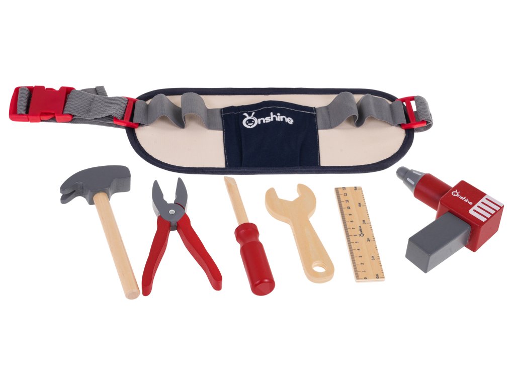 - adjustable tool belt max 50 cm x 14 cm, - hammer approx. 17 cm x 7.5 cm x 2.5 cm, - pliers approx. 15.5 cm x 4 cm x 1.5 cm, - screwdriver approx. 10.5 cm x 12.5 cm x 4 cm, - open-end wrench approx. 13.5 cm x 5 cm x 1 cm, - measuring cup approx. 13.5 cm x 3 cm x 0.5 cm, - screwdriver approx. 16 cm x 2.5 cm, - package approx. 34 cm x 14.3 cm x 7 cm. |