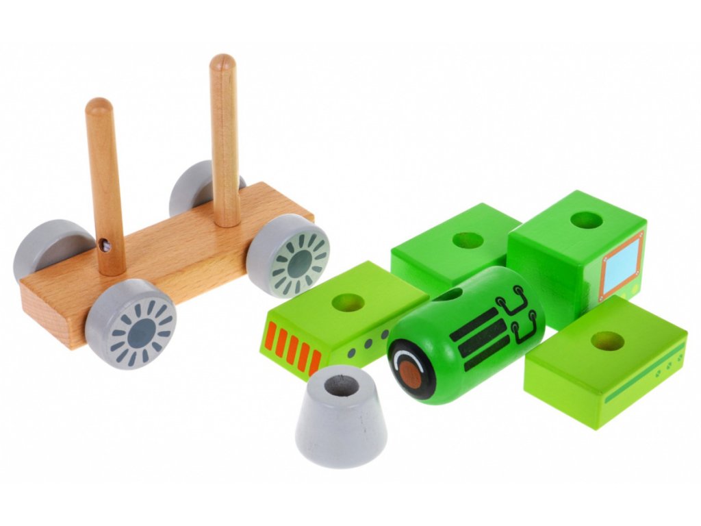 - 6 blocks, - a stand with wooden pins, - 4 movable wheels. |