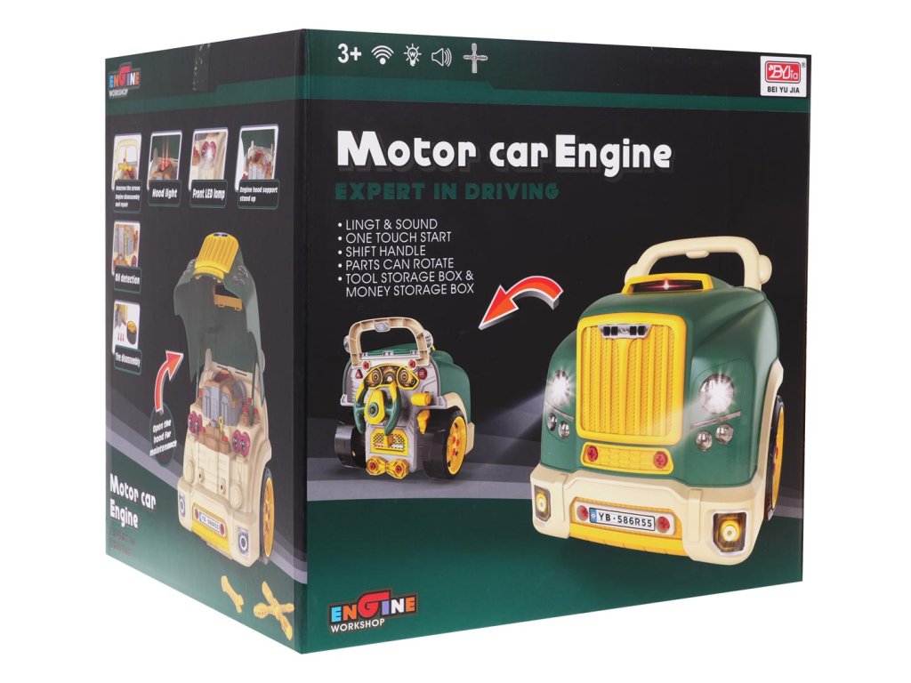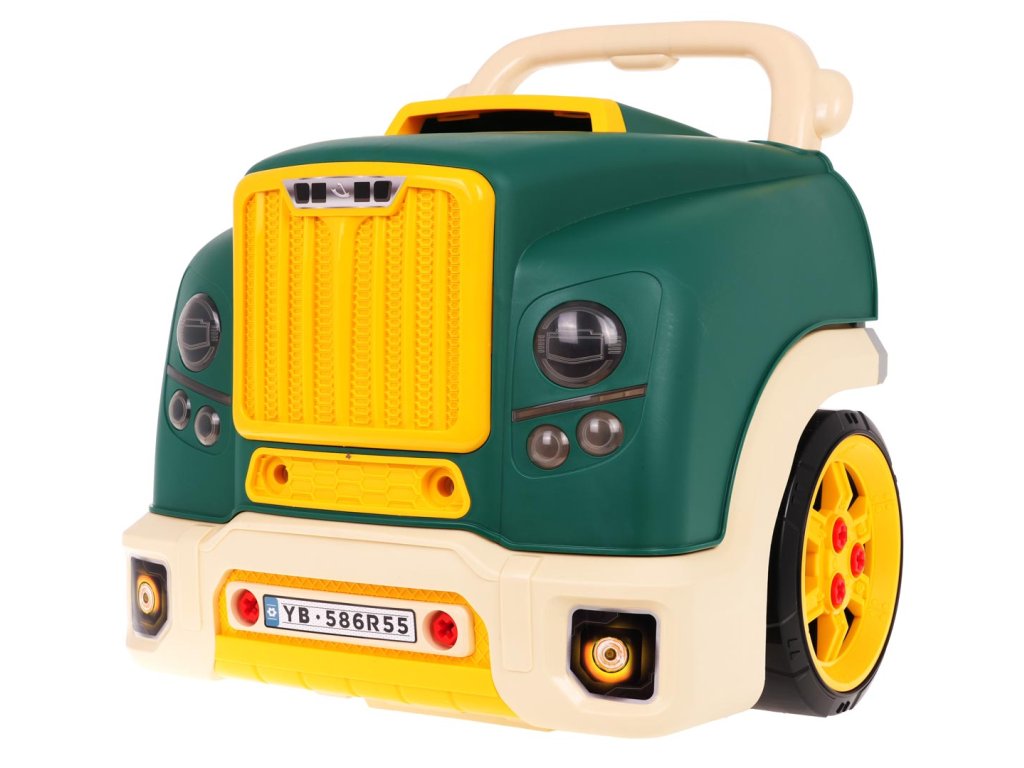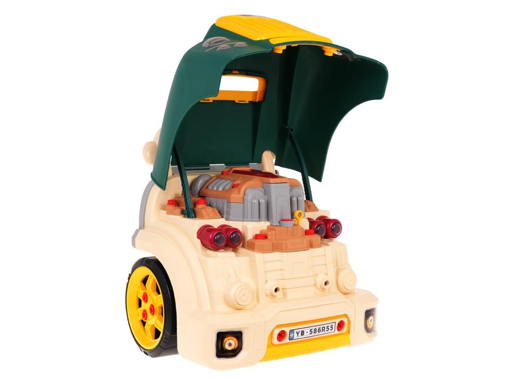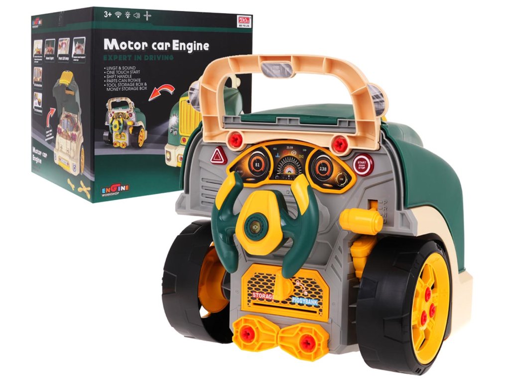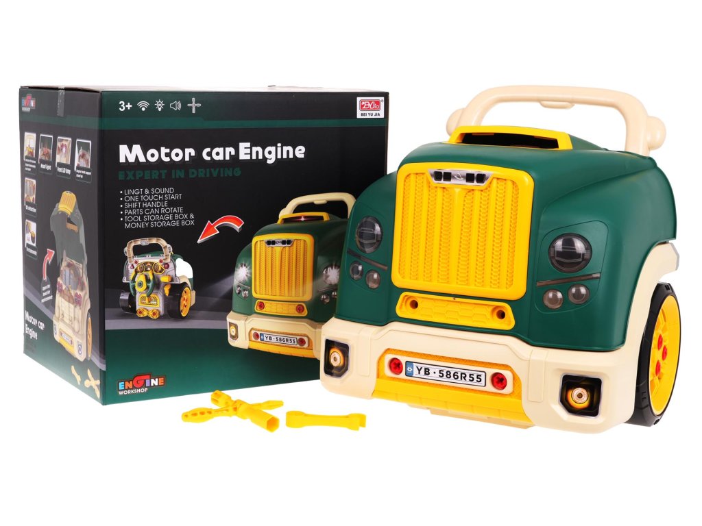 Interactive toy, the front of a green truck with a lifting hood and dashboard designed for children aged 3 and over. The set includes parts to assemble the front of the truck and tools needed for assembly and disassembly, parts such as a screwdriver or wrenches. Under the hood of the vehicle there is a large, disassembled engine, which the child can disassemble into its prime factors. Spark plugs and wheels can also be replaced. On the dashboard there is a vehicle start button with engine starting sounds, a steering wheel with a horn and an emergency signal. There is a storage compartment under the steering wheel, in which you can put all the necessary tools, screws, knobs. The toy has a convenient carrying handle. Powered by 3 x AA 1.5 V batteries (not included). The toy for a small mechanic develops manual skills, fine motor skills and eye-hand coordination.