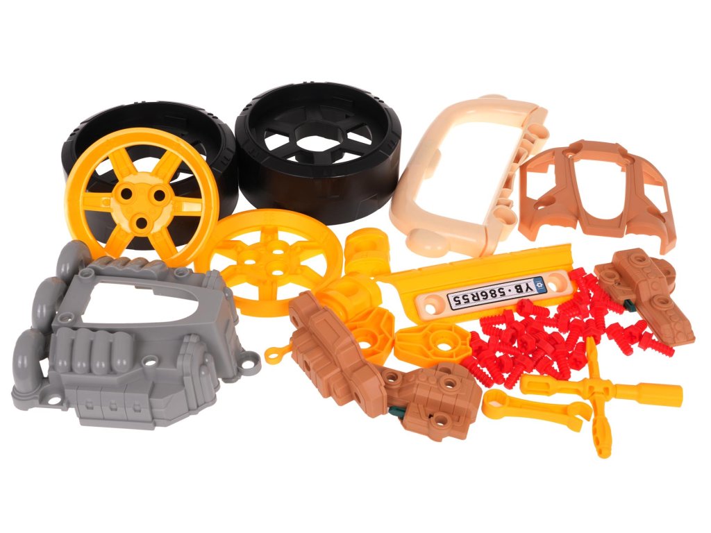 - the front part of the vehicle with the engine disassembled, - wheels with hubcaps, -31 screws, - tools, - decorative stickers, - instructions. |