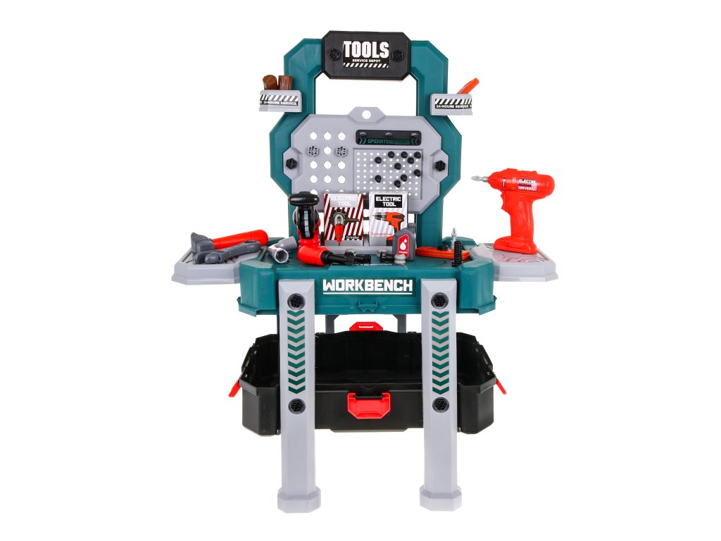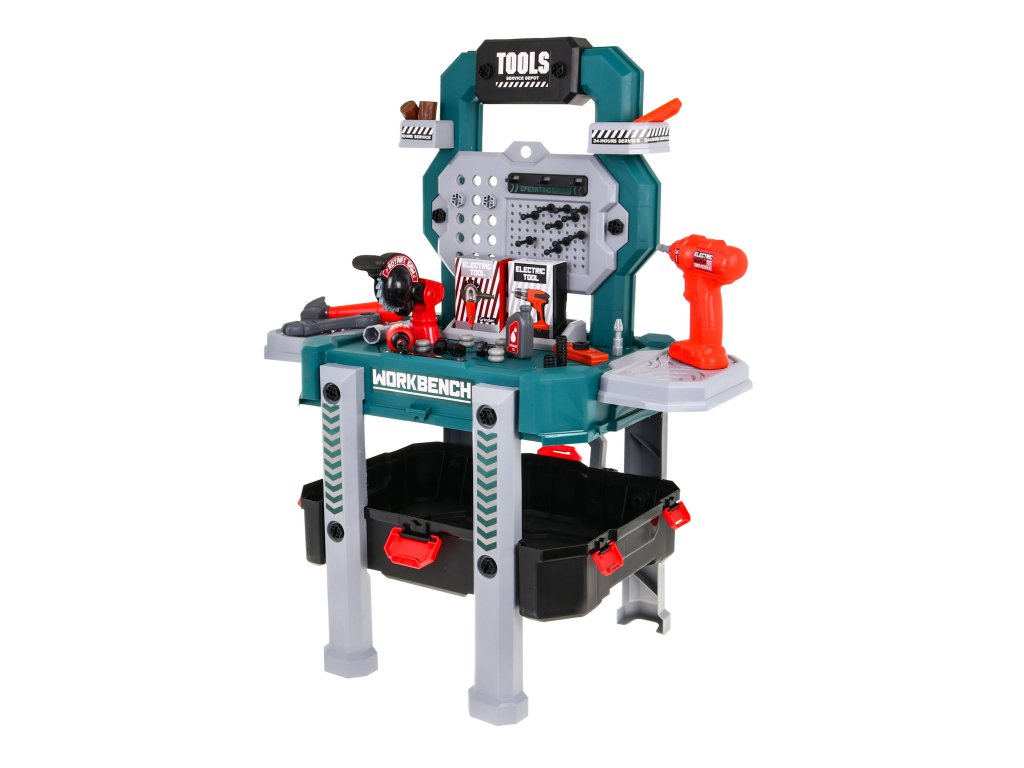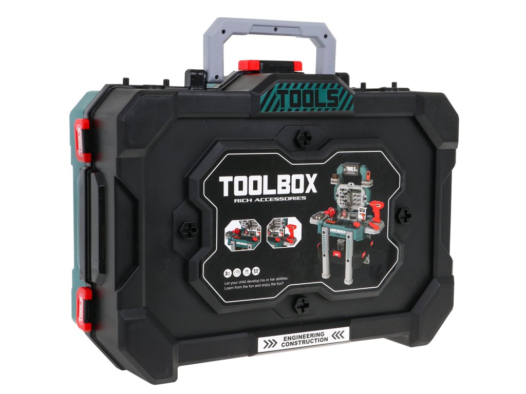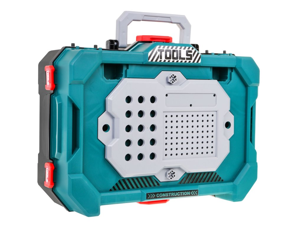 | A well-equipped workshop with a drill, saw and accessories is a proposal for children from 3 years of age. The set consists of 78 elements that resemble real tools. The drill / driver makes noises when screwing in and out and has two interchangeable bits. The individual tools can be freely arranged on the practical stand. After the fun is over, all the elements can be closed in a large tool case with a convenient carrying handle. The toy is powered by 2 x AA batteries (not included). |