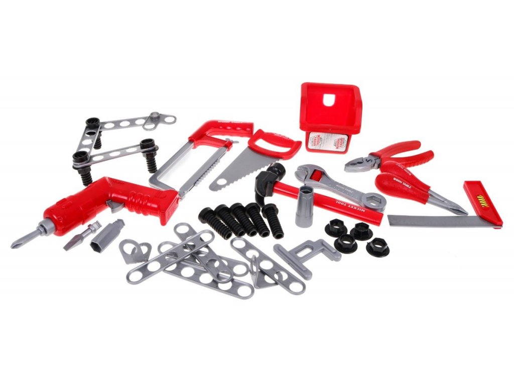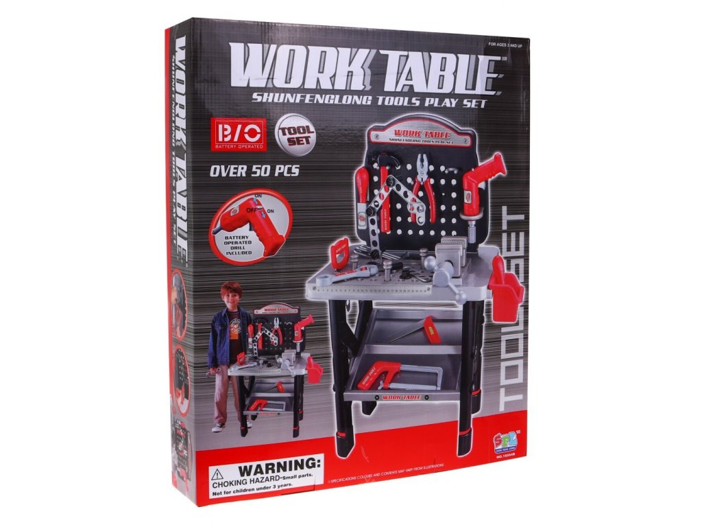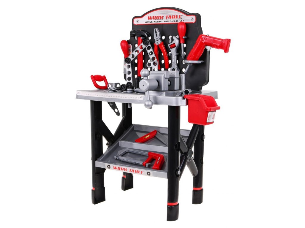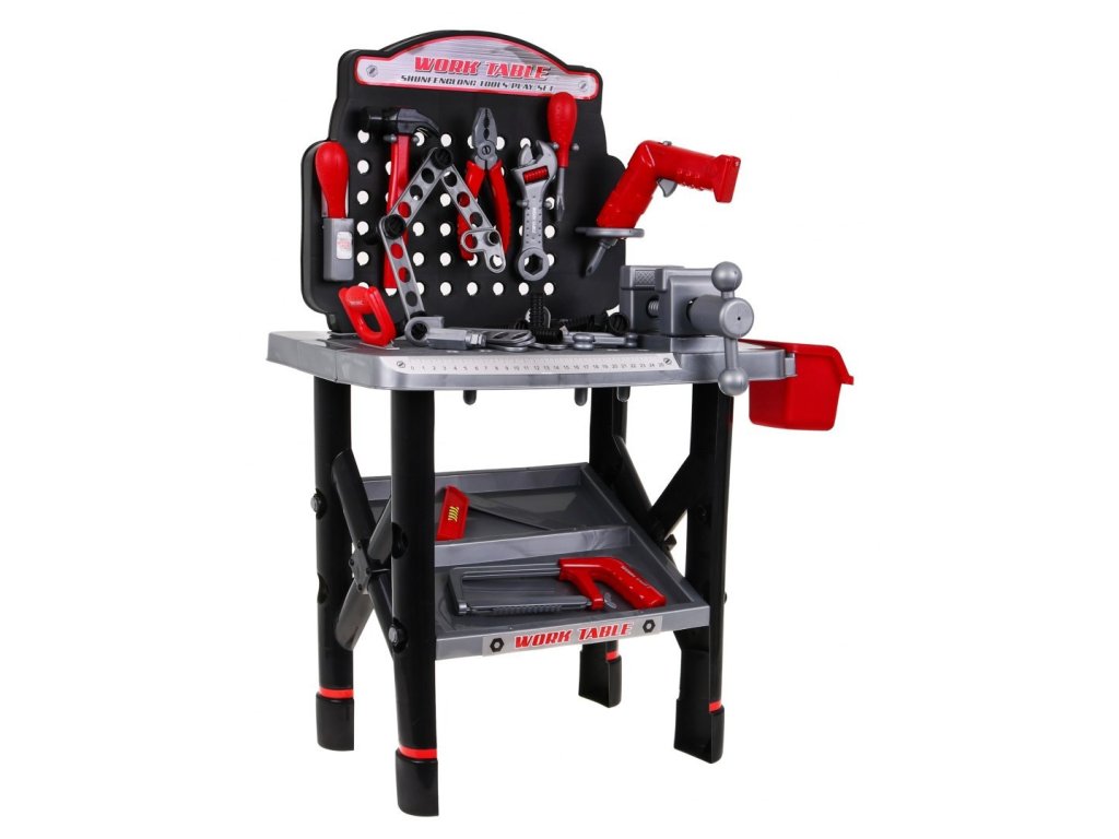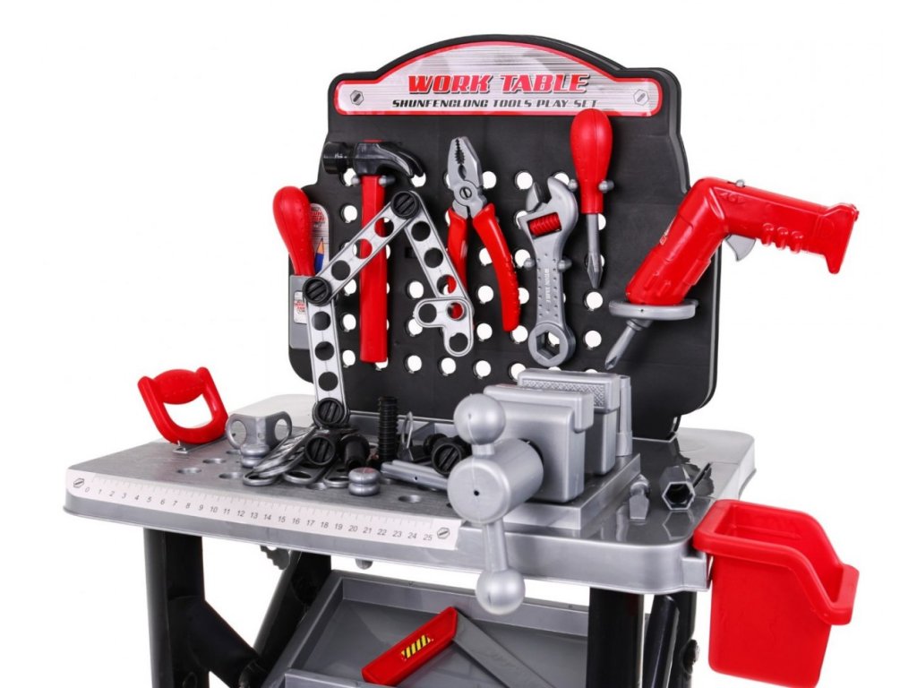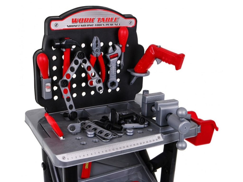 | Amazing, richly equipped workshop with a vice and tools. The kit includes everything that a DIYer needs. The screwdriver / drill makes noises when screwing in / out, and has two interchangeable tips. Individual tools can be arranged on a practical stand. The set develops manual skills, imagination and creativity. The toy is powered by 2 x AA batteries (not included). The toy is intended for children from 3 years old and has the CE certificate. |