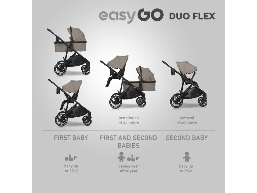 Multifunkční kočárek DUOFLEX od EasyGo lze použít jako kočárek pro jedno dítě (v kočárku nebo 2-v-1 verzi s jedním přenosovým a jedním kočárkem) a když se k rodině připojí druhé dítě, lze jej přestavět na kočárek pro dvě děti bez nutnosti kupovat další součástky. Stačí nainstalovat přiložený adaptér pro druhý modul a hlavní adaptér posunout výš v racku. Tímto způsobem můžete na rám kočárku DUOFLEX současně nainstalovat přenosnou postýlku pro mladší dítě a sedačku pro starší dítě.