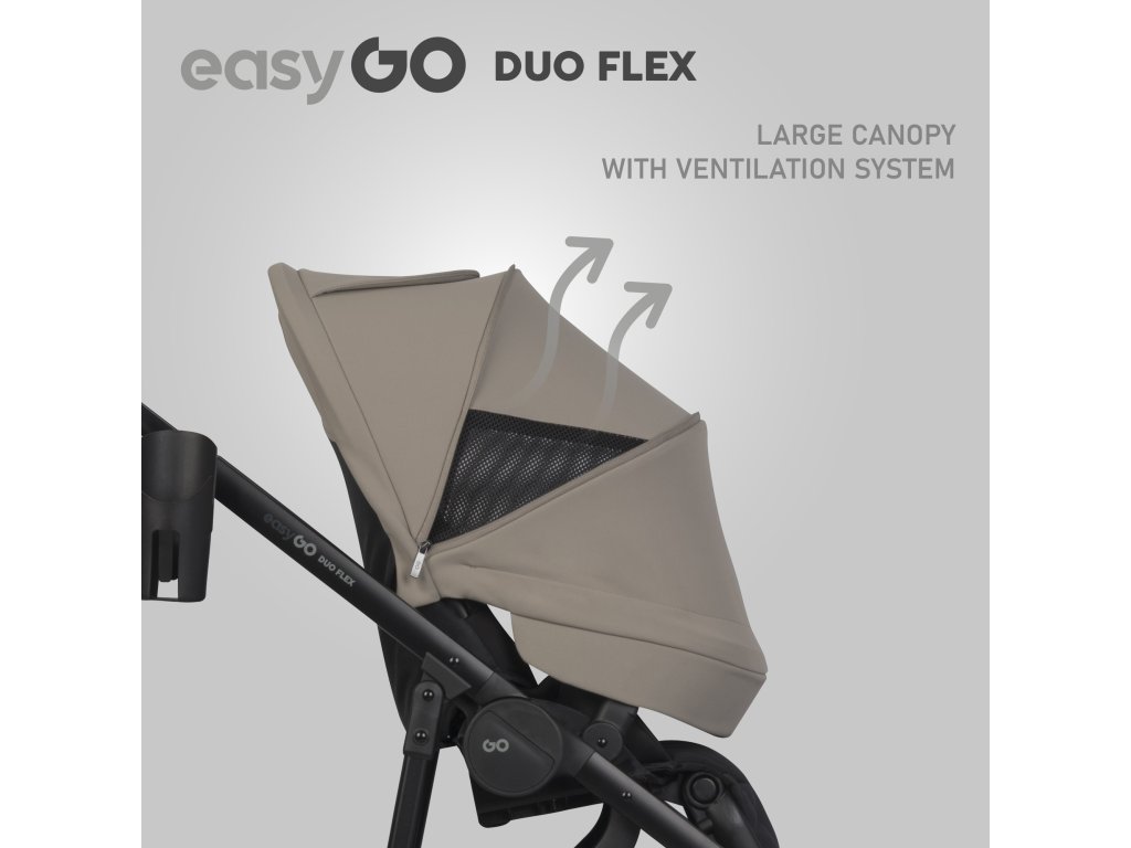 Přepravka kočárku DUOFLEX je velká (77 cm) a má až 3 uzamykatelné ventilační panely zakončené síťovinou, díky čemuž bude fungovat po celý rok. Velký sluneční baldachýn se skládacím baldachýnem lze díky další odnímatelné části naklonit dopředu. Sedačka kočárku DUOFLEX od EasyGo je navržena pro děti do hmotnosti 22 kg.