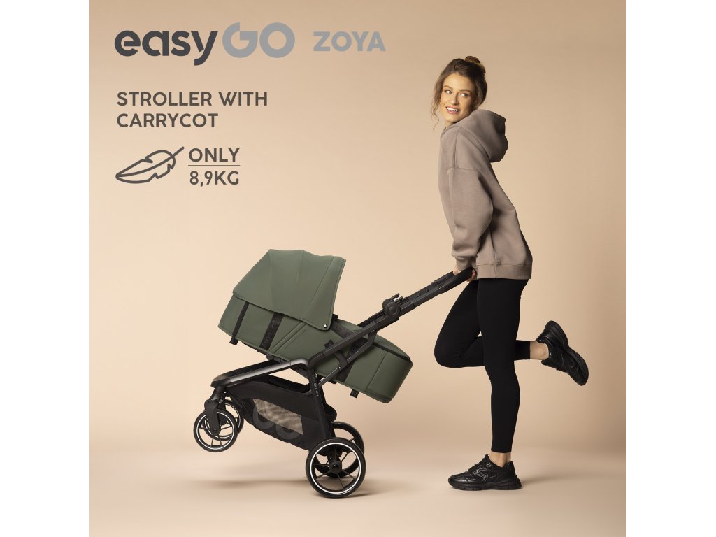 Má nosítka, sluneční přístřešek, odnímatelný kryt a plastové podpěry, takže ho můžete položit na zem bez rizika špiny. Nosítko ZOYA je také velmi lehké. Jeho hmotnost je pouze 2,5 kg, díky čemuž kočárek spolu s přepravkou váží pouze 8,9 kg, což z něj činí jeden z nejlehčích kočárků 2v1 na trhu.