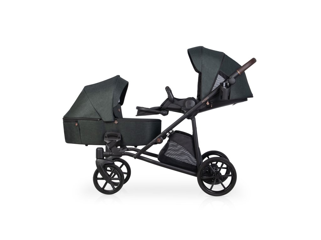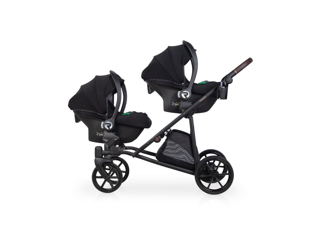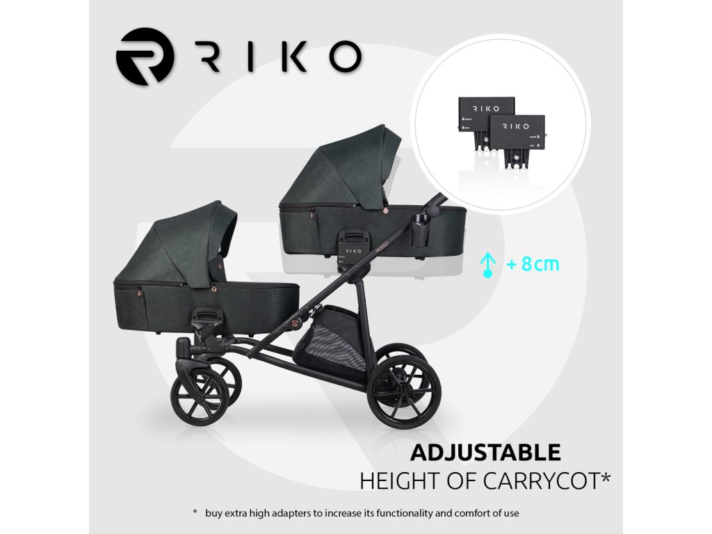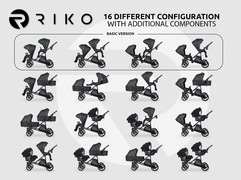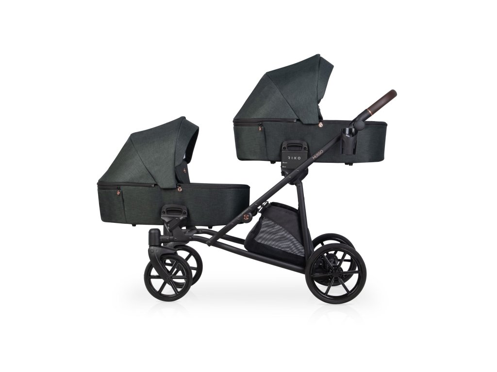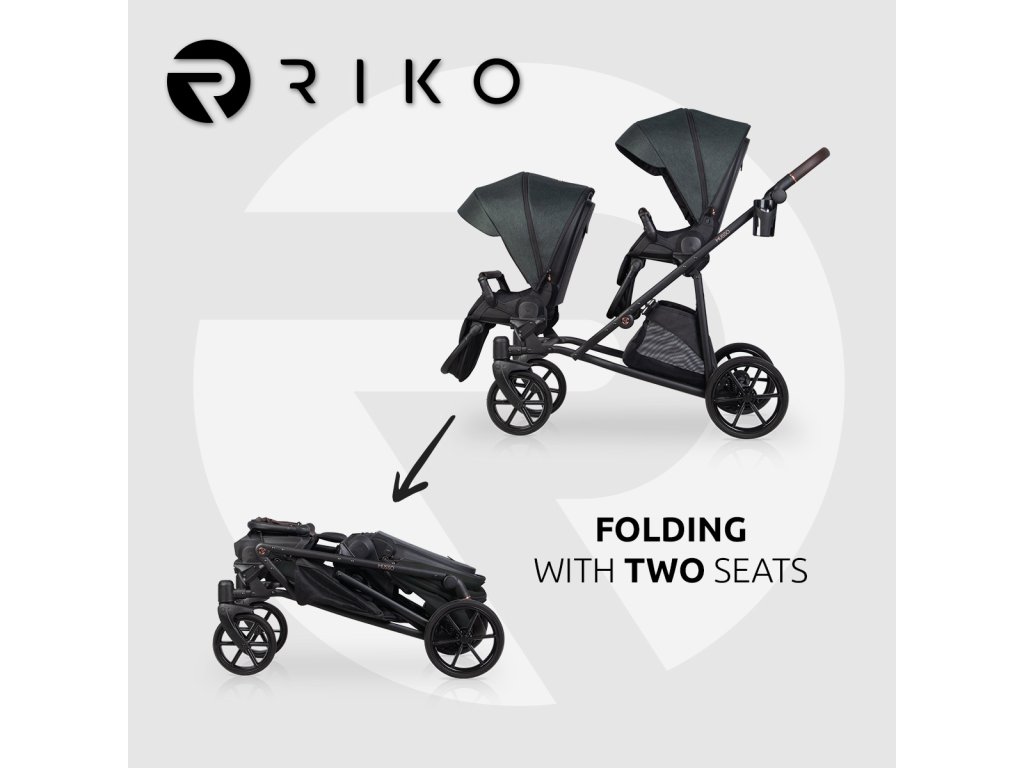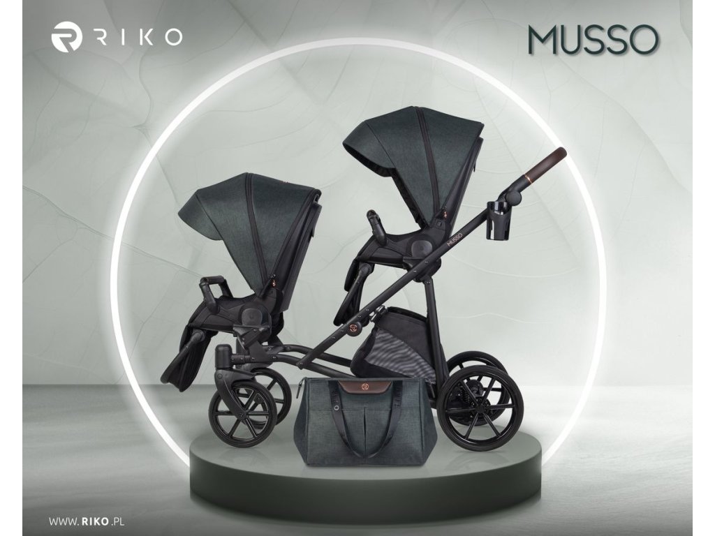 Kočárek pro dvojčata nebo děti rok co rok MUSSO by RIKO - pro dvě děti Společnost RIKO je jedním z předních výrobců kočárků v Evropě. Více než 20 let zkušeností s výrobou kočárků vede ke stále modernějším a lepším výrobkům. V roce 2024 prošla značka RIKO kompletní metamorfózou, když začala vyrábět prémiové kočárky z nejkvalitnějších materiálů a v nejvyšším standardu zpracování, který je na trhu k dispozici. Výrobky jsou moderní a funkční a jejich kvalita je zaručena vlastními stroji na testování odolnosti a zkušeným týmem kontrolorů kvality. Kočárek MUSSO pro dvě děti od společnosti RIKO může být buď kočárkem pro dvojčata, nebo pro dvě děti různého věku až do hmotnosti 22 kg. Základní verze je rám se dvěma sedačkami kočárku určený pro děti od 6 měsíců do 22 kg. Navíc lze dokoupit jednu nebo dvě korbičky a vytvořit tak multifunkční kočárek 2 v 1 pro dvojčata (se dvěma korbičkami a dvěma sedadly) nebo pro děti od jednoho roku (s jednou korbičkou a jedním sedadlem). Rozšířením sady o jednu nebo dvě autosedačky RIKO COSMO by AVIONAUT získáte kočárek 3 v 1. Díky možnosti použití univerzálních adaptérů na autosedačky pro děti ve výškové skupině 40-87 cm lze do kočárku MUSSO instalovat autosedačky jiných známých značek s univerzálními klipy tzv. Tandemový kočárek RIKO MUSSO umožňuje až 16 různých konfigurací kočárkové sedačky, korbičky a autosedačky. Obě autosedačky je možné umístit po i proti směru jízdy, stejně jako po i proti směru jízdy. RIKO MUSSO je jedním z mála kočárků na trhu, který také umožňuje libovolnou konfiguraci kombinace jedné autosedačky s jednou autosedačkou, včetně možnosti montáže autosedačky na přední modul po směru jízdy, zatímco autosedačka je namontována na zadní modul. Na rámu kočárku lze samozřejmě současně vozit dvě korbičky nebo dvě autosedačky. Volitelně lze kočárek MUSSO vybavit také adaptéry na nánožníky, které dále zvyšují jeho funkčnost a pohodlí. Adaptéry umožňují zvětšit vzdálenost mezi jednotlivými moduly, což se bude hodit zejména při použití verze se dvěma korbičkami nebo dvěma autosedačkami. U takových kombinací se použitím posilovacích adaptérů na zadním modulu zvýší světlá výška a zajistí pohodlnější přístup k dětem. Kočárek RIKO MUSSO pro dvě děti lze složit společně s oběma sedačkami do kompaktní velikosti pro tento typ kočárku. Hmotnost kočárku také není pro dvojitý tandemový kočárek vysoká. Samotný rám včetně kol váží pouhých 9,5 kg, což je vynikající hodnota. Díky "sendvičovým" skládacím sedačkám a plochému skládacímu korbičce se vám kočárek vejde do kufru auta. Gondoly kočárku RIKO MUSSO se liší pro přední a zadní modul. Při výběru verze kočárku s jednou korbičkou uveďte v objednávce, zda si vybíráte korbičku pro přední (spodní) nebo zadní (horní) modul. Nosné korby mají odlišné uspořádání adaptérů, takže je možný větší počet konfigurací kočárku. Díky dvěma velkým větracím panelům jsou nosítka ideální pro teplé letní dny, kdy umožňují cirkulaci vzduchu. Přední větrací panel se síťkou bude pro vaše dítě fungovat také jako okno. Oba panely jsou pevně uzavíratelné pomocí zipů, takže nosítko je celoroční. Součástí základní verze kočárku je rám s koly a košíkem, dvě autosedačky, dva nánožníky, dvě dešťové fólie, dvě moskytiéry, dvě bezpečnostní zábrany a velká stylová taška s upevňovacím systémem na madlo kočárku. Autosedačka RIKO COSMO je určena pro kočárky RIKO a je vyráběna systémem Dual Branding renomovaného výrobce autosedaček Avionaut. Autosedačka má nové evropské schválení R129 platné od září 2023 a je k dispozici také ve verzi I-SIZE se základnou ISOFIX DOCK 2 od společnosti Avionaut. Díky možnosti zakoupení univerzálních adaptérů lze na rám kočárku připevnit i autosedačky jiných značek, pokud jsou vybaveny univerzálními klipy typu "Maxi Cosi" (podrobnosti si vyžádejte u svého prodejce). TECHNICKÉ SPECIFIKACE: - multifunkční kočárek pro děti od narození do 22 kg splňující normy EN 1888-1:2018 a EN 1888-2:2018, - tandemový kočárek určený pro dvojčata nebo dvě děti různého věku do 22 kg, - dvě plnohodnotné sedačky s obousměrným uchycením, - možnost složení kočárku společně s oběma sedačkami, - možnost montáže jedné nebo dvou korbiček pro děti do 9 kg, - možnost montáže jedné nebo dvou autosedaček RIKO COSMO by AVIONAUT nebo jiných autosedaček pro skupinu 40-87 cm, které mají tzv. univerzální klipy typu "maxi Cosi". univerzální maxi cosi přípojky - 16 různých konfigurací (podle toho, kterou verzi si vyberete) - výškově nastavitelné madlo pro přenášení - parkovací brzda ovládaná stisknutím horní části - plochá skládací korbička - větrací panel v korbičce - bavlněné polstrování v korbičce - pětibodové bezpečnostní pásy s magnetickou sponou - kvalitní kůže na madlo a popruh pro přenášení - houpací popruh pro přenášení, - systém tlumení nárazů na všech kolech, - nastavitelná tvrdost odpružení zadních kol, - odlehčená kola s gelovými pneumatikami (polyuretan), - košík pod kočárkem, - taška připevněná na rukojeti, - otočná přední kola s aretací pro přímou jízdu, - čtyřstupňové nastavení opěradla od pololehu do úplného sedu, - prodlužovací sluneční stříška na sedadle kočárku, - pláštěnka, - moskytiéra, - nánožník. Rozměry rámu: rozložený rám s koly: 119 x 102 x 60 cm Folded frame with wheels: Složený rám se sedadlem a koly: 104 x 49 x 60 cm: 104 x 57 x 60 cm Rozsah nastavení rukojeti (od země): 60 - 109 cm Rozměry sedadla: 60 - 109 cm Rozm