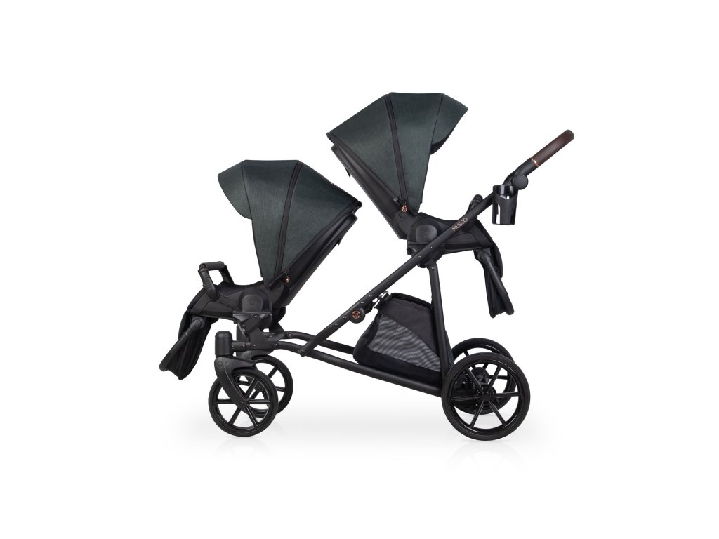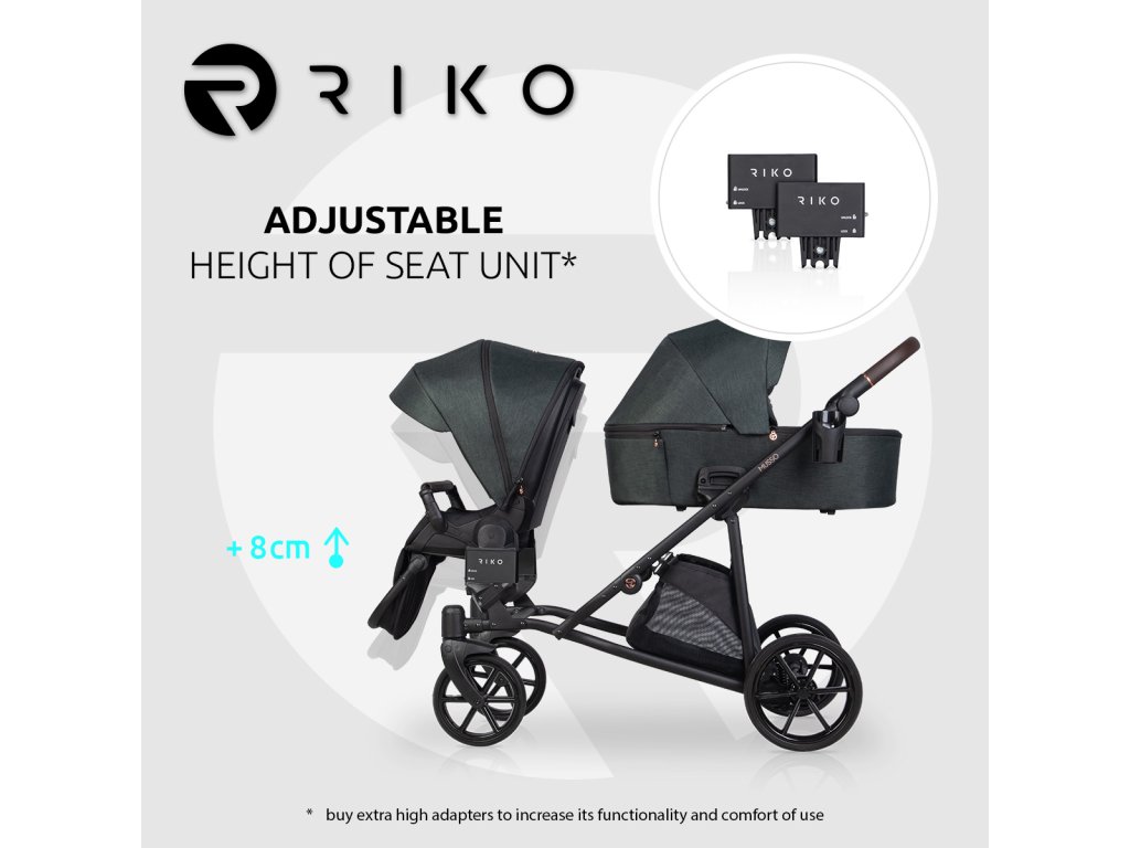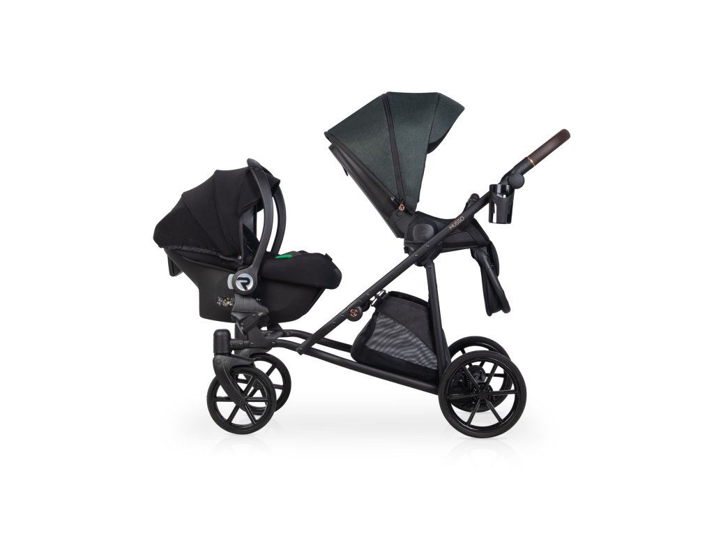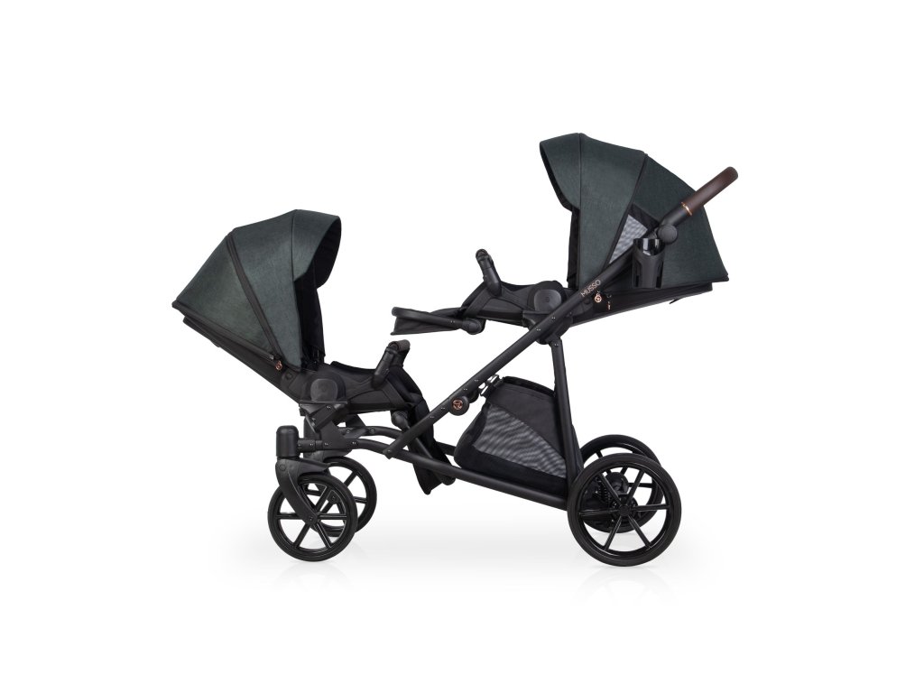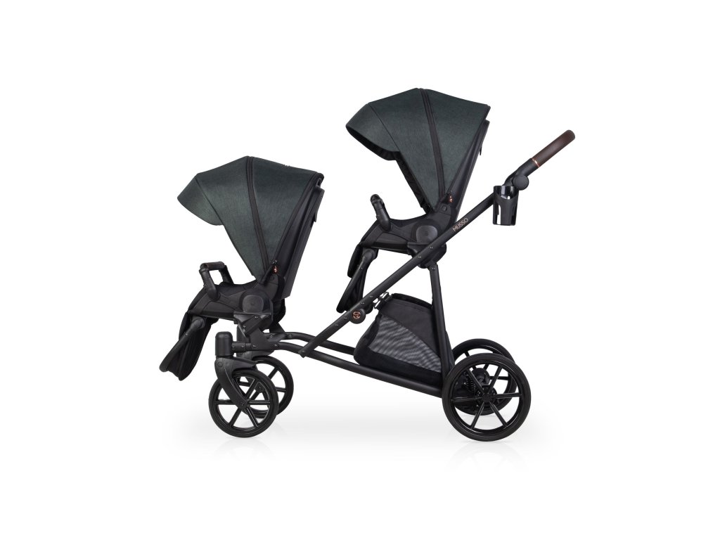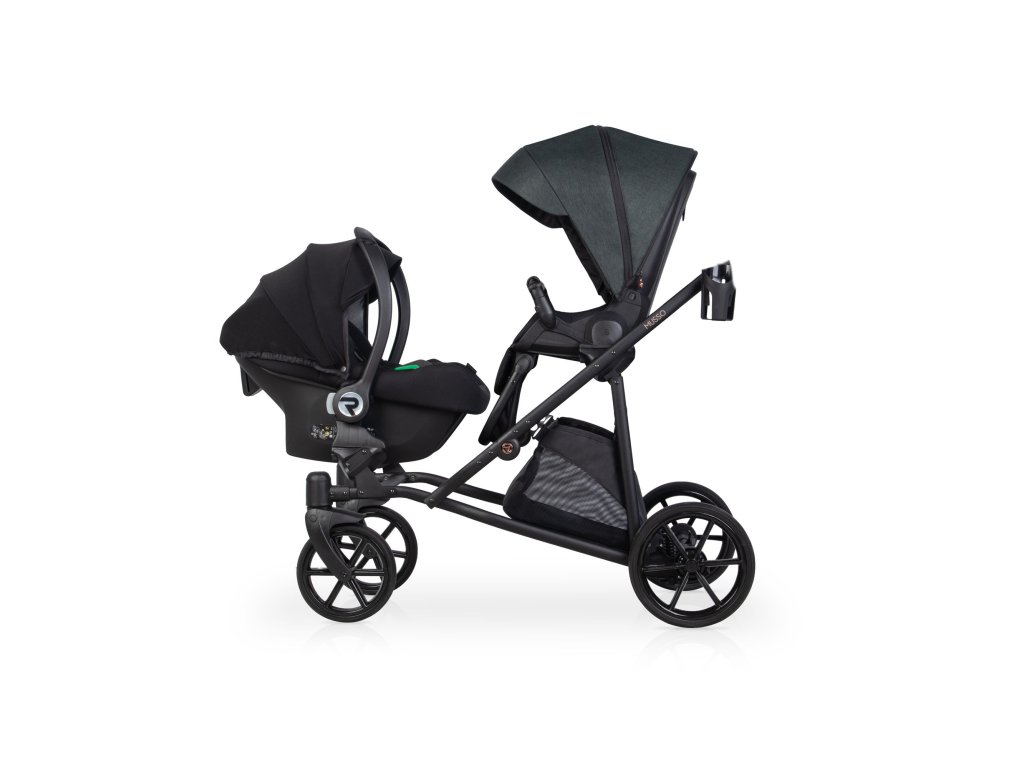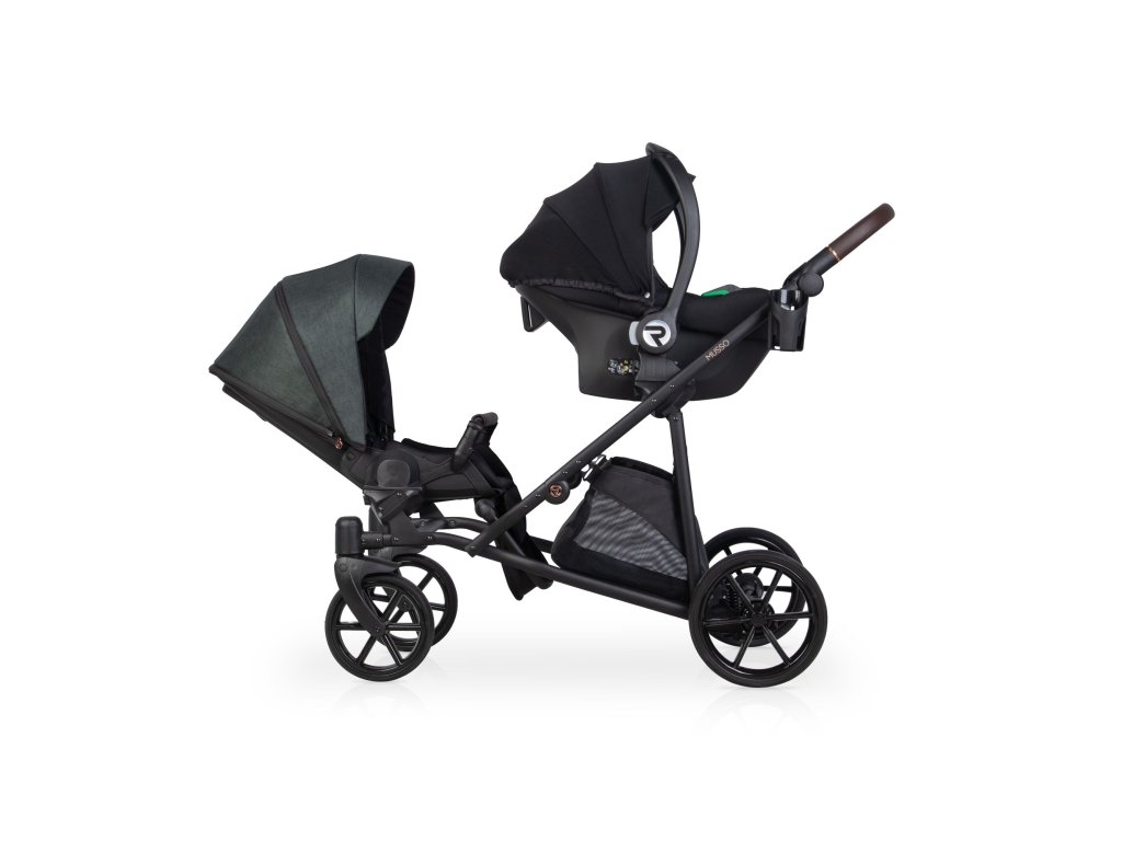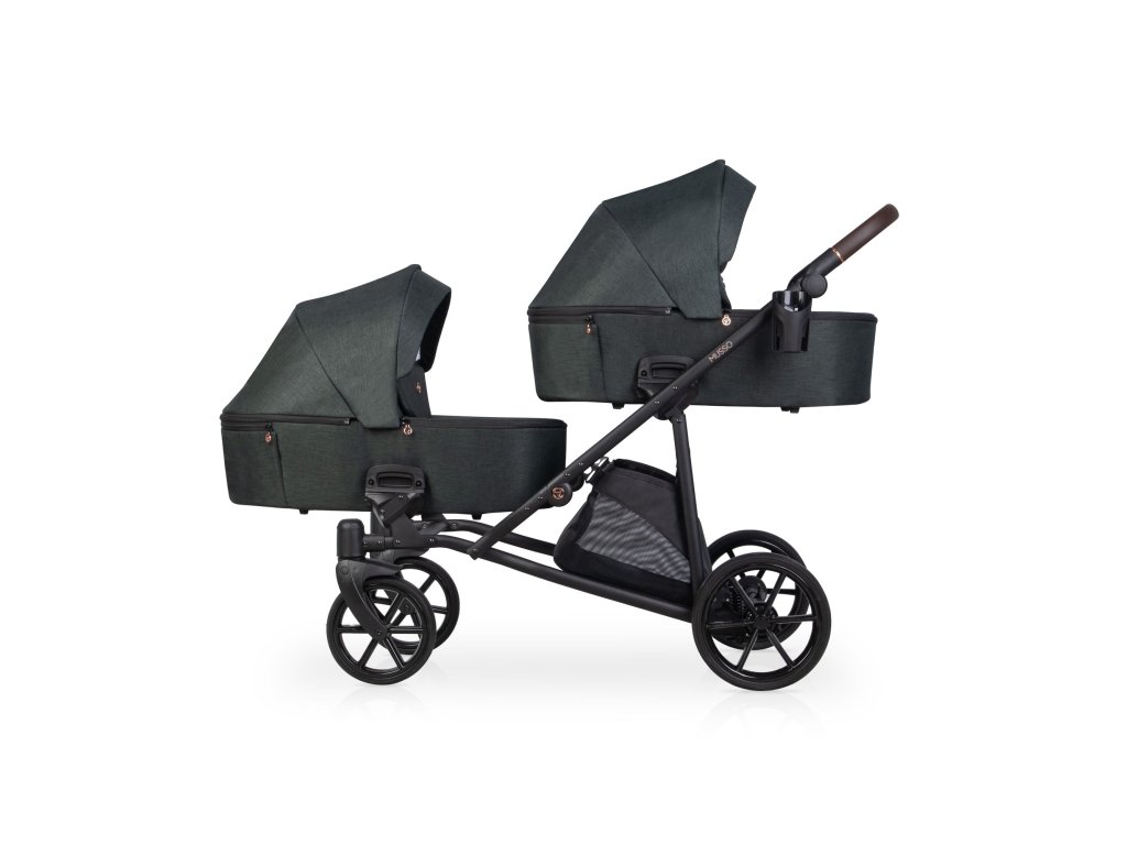 Kočárek pro dvojčata nebo děti rok co rok MUSSO by RIKO - pro dvě děti Společnost RIKO je jedním z předních výrobců kočárků v Evropě. Více než 20 let zkušeností s výrobou kočárků vede ke stále modernějším a lepším výrobkům. V roce 2024 prošla značka RIKO kompletní metamorfózou, když začala vyrábět prémiové kočárky z nejkvalitnějších materiálů a v nejvyšším standardu zpracování, který je na trhu k dispozici. Výrobky jsou moderní a funkční a jejich kvalita je zaručena vlastními stroji na testování odolnosti a zkušeným týmem kontrolorů kvality. Kočárek MUSSO pro dvě děti od společnosti RIKO může být buď kočárkem pro dvojčata, nebo pro dvě děti různého věku až do hmotnosti 22 kg. Základní verze je rám se dvěma sedačkami kočárku určený pro děti od 6 měsíců do 22 kg. Navíc lze dokoupit jednu nebo dvě korbičky a vytvořit tak multifunkční kočárek 2 v 1 pro dvojčata (se dvěma korbičkami a dvěma sedadly) nebo pro děti od jednoho roku (s jednou korbičkou a jedním sedadlem). Rozšířením sady o jednu nebo dvě autosedačky RIKO COSMO by AVIONAUT získáte kočárek 3 v 1. Díky možnosti použití univerzálních adaptérů na autosedačky pro děti ve výškové skupině 40-87 cm lze do kočárku MUSSO instalovat autosedačky jiných známých značek s univerzálními klipy tzv. Tandemový kočárek RIKO MUSSO umožňuje až 16 různých konfigurací kočárkové sedačky, korbičky a autosedačky. Obě autosedačky je možné umístit po i proti směru jízdy, stejně jako po i proti směru jízdy. RIKO MUSSO je jedním z mála kočárků na trhu, který také umožňuje libovolnou konfiguraci kombinace jedné autosedačky s jednou autosedačkou, včetně možnosti montáže autosedačky na přední modul po směru jízdy, zatímco autosedačka je namontována na zadní modul. Na rámu kočárku lze samozřejmě současně vozit dvě korbičky nebo dvě autosedačky. Volitelně lze kočárek MUSSO vybavit také adaptéry na nánožníky, které dále zvyšují jeho funkčnost a pohodlí. Adaptéry umožňují zvětšit vzdálenost mezi jednotlivými moduly, což se bude hodit zejména při použití verze se dvěma korbičkami nebo dvěma autosedačkami. U takových kombinací se použitím posilovacích adaptérů na zadním modulu zvýší světlá výška a zajistí pohodlnější přístup k dětem. Kočárek RIKO MUSSO pro dvě děti lze složit společně s oběma sedačkami do kompaktní velikosti pro tento typ kočárku. Hmotnost kočárku také není pro dvojitý tandemový kočárek vysoká. Samotný rám včetně kol váží pouhých 9,5 kg, což je vynikající hodnota. Díky "sendvičovým" skládacím sedačkám a plochému skládacímu korbičce se vám kočárek vejde do kufru auta. Gondoly kočárku RIKO MUSSO se liší pro přední a zadní modul. Při výběru verze kočárku s jednou korbičkou uveďte v objednávce, zda si vybíráte korbičku pro přední (spodní) nebo zadní (horní) modul. Nosné korby mají odlišné uspořádání adaptérů, takže je možný větší počet konfigurací kočárku. Díky dvěma velkým větracím panelům jsou nosítka ideální pro teplé letní dny, kdy umožňují cirkulaci vzduchu. Přední větrací panel se síťkou bude pro vaše dítě fungovat také jako okno. Oba panely jsou pevně uzavíratelné pomocí zipů, takže nosítko je celoroční. Součástí základní verze kočárku je rám s koly a košíkem, dvě autosedačky, dva nánožníky, dvě dešťové fólie, dvě moskytiéry, dvě bezpečnostní zábrany a velká stylová taška s upevňovacím systémem na madlo kočárku. Autosedačka RIKO COSMO je určena pro kočárky RIKO a je vyráběna systémem Dual Branding renomovaného výrobce autosedaček Avionaut. Autosedačka má nové evropské schválení R129 platné od září 2023 a je k dispozici také ve verzi I-SIZE se základnou ISOFIX DOCK 2 od společnosti Avionaut. Díky možnosti zakoupení univerzálních adaptérů lze na rám kočárku připevnit i autosedačky jiných značek, pokud jsou vybaveny univerzálními klipy typu "Maxi Cosi" (podrobnosti si vyžádejte u svého prodejce). TECHNICKÉ SPECIFIKACE: - multifunkční kočárek pro děti od narození do 22 kg splňující normy EN 1888-1:2018 a EN 1888-2:2018, - tandemový kočárek určený pro dvojčata nebo dvě děti různého věku do 22 kg, - dvě plnohodnotné sedačky s obousměrným uchycením, - možnost složení kočárku společně s oběma sedačkami, - možnost montáže jedné nebo dvou korbiček pro děti do 9 kg, - možnost montáže jedné nebo dvou autosedaček RIKO COSMO by AVIONAUT nebo jiných autosedaček pro skupinu 40-87 cm, které mají tzv. univerzální klipy typu "maxi Cosi". univerzální maxi cosi přípojky - 16 různých konfigurací (podle toho, kterou verzi si vyberete) - výškově nastavitelné madlo pro přenášení - parkovací brzda ovládaná stisknutím horní části - plochá skládací korbička - větrací panel v korbičce - bavlněné polstrování v korbičce - pětibodové bezpečnostní pásy s magnetickou sponou - kvalitní kůže na madlo a popruh pro přenášení - houpací popruh pro přenášení, - systém tlumení nárazů na všech kolech, - nastavitelná tvrdost odpružení zadních kol, - odlehčená kola s gelovými pneumatikami (polyuretan), - košík pod kočárkem, - taška připevněná na rukojeti, - otočná přední kola s aretací pro přímou jízdu, - čtyřstupňové nastavení opěradla od pololehu do úplného sedu, - prodlužovací sluneční stříška na sedadle kočárku, - pláštěnka, - moskytiéra, - nánožník. Rozměry rámu: rozložený rám s koly: 119 x 102 x 60 cm Folded frame with wheels: Složený rám se sedadlem a koly: 104 x 49 x 60 cm: 104 x 57 x 60 cm Rozsah nastavení rukojeti (od země): 60 - 109 cm Rozměry sedadla: 60 - 109 cm Rozm