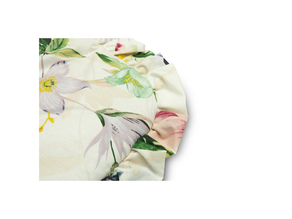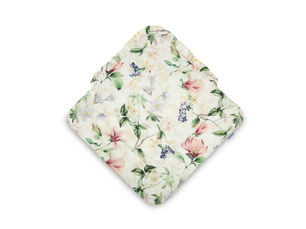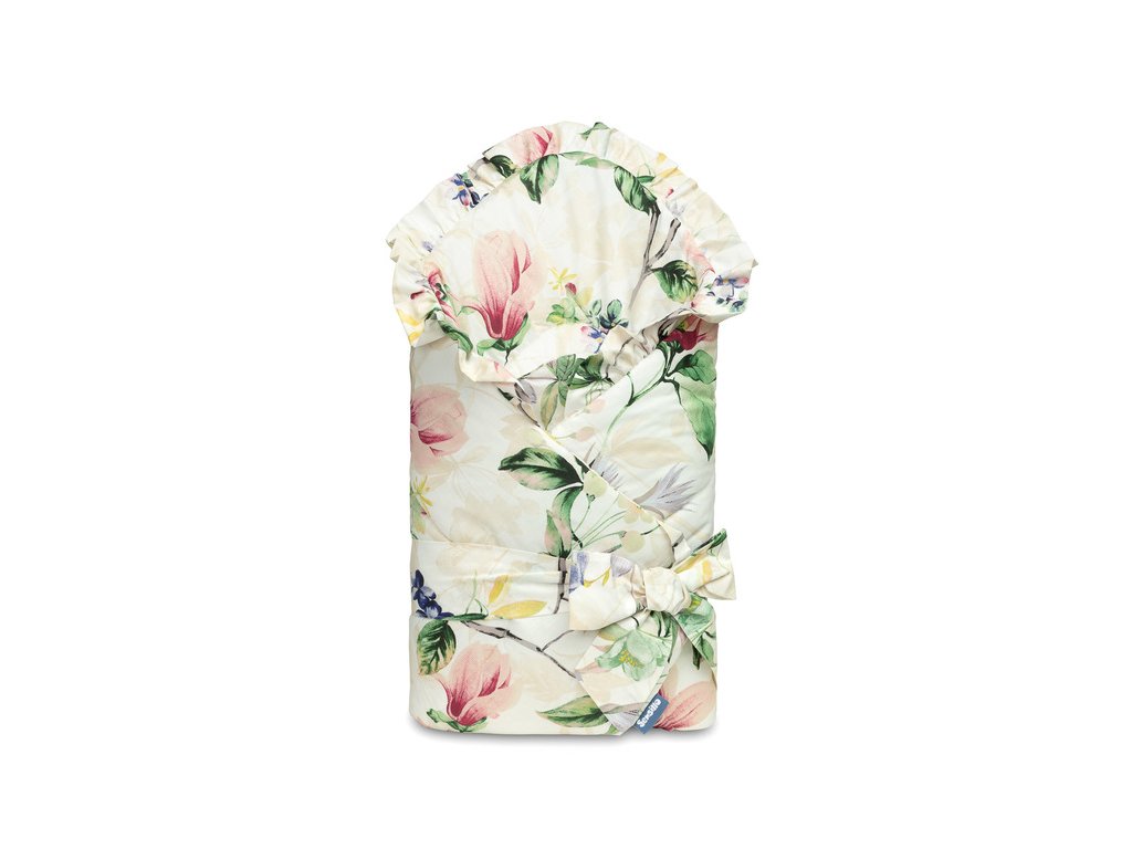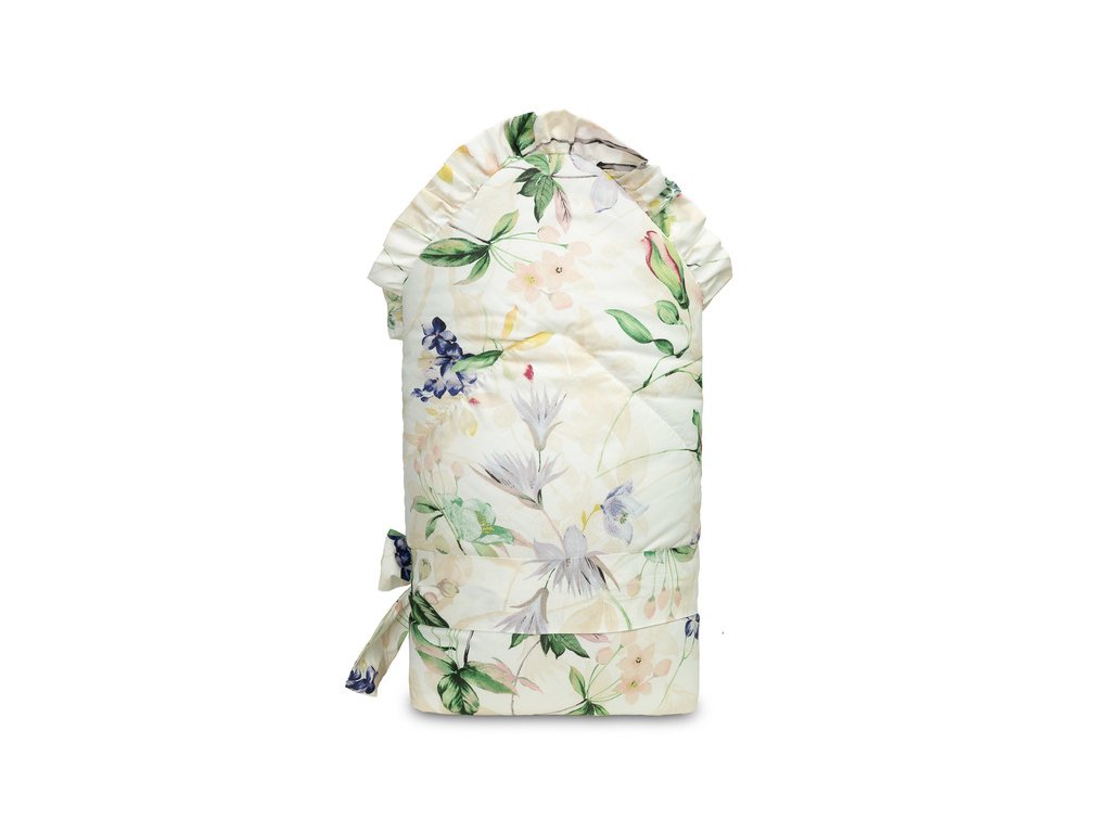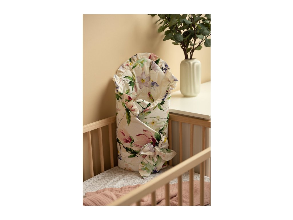 Dwustronny rożek niemowlęcy z falbanką został stworzony z myślą o noworodkach i niemowlętach. Wiązane zapięcie z szeroką bawełnianą tasiemką umożliwia wygodne trzymanie dziecka podczas karmienia i usypiania. Po rozłożeniu, rożek może być z powodzeniem stosowany jako kołderka do łóżeczka czy wózka dziecięcego. Może także służyć jako mata do zabawy. Wykonany został z bawełny 100%. Wypełnienie rożka to włóknina puszysta silikonowa. Wykończenie stanowi gustowna falbanka.