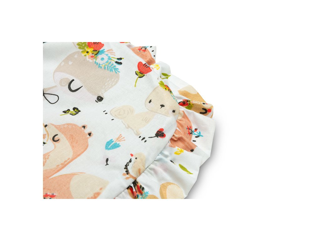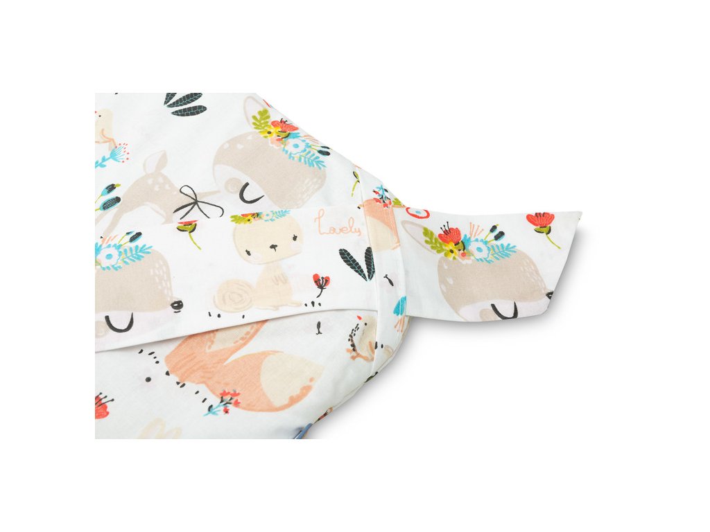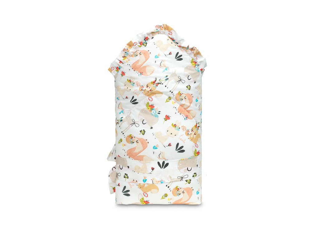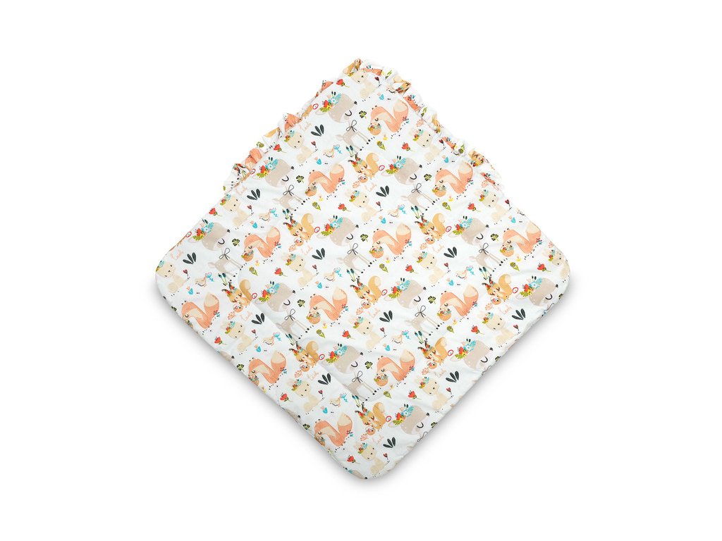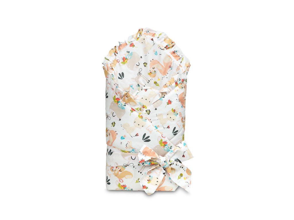 Dwustronny rożek niemowlęcy z falbanką został stworzony z myślą o noworodkach i niemowlętach. Wiązane zapięcie z szeroką bawełnianą tasiemką umożliwia wygodne trzymanie dziecka podczas karmienia i usypiania. Po rozłożeniu, rożek może być z powodzeniem stosowany jako kołderka do łóżeczka czy wózka dziecięcego. Może także służyć jako mata do zabawy. Wykonany został z bawełny 100%. Wypełnienie rożka to włóknina puszysta silikonowa. Wykończenie stanowi gustowna falbanka.