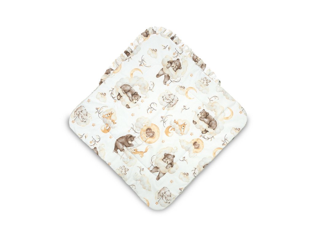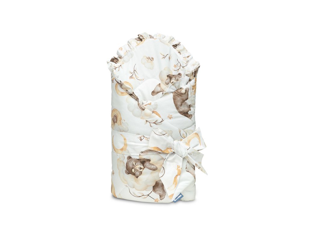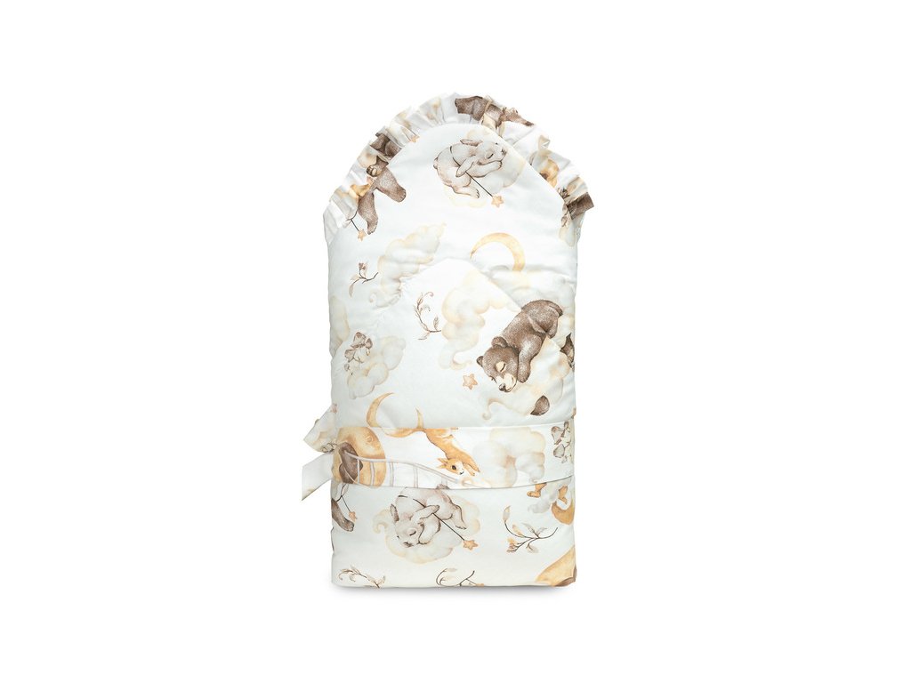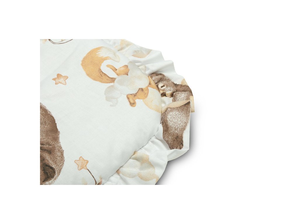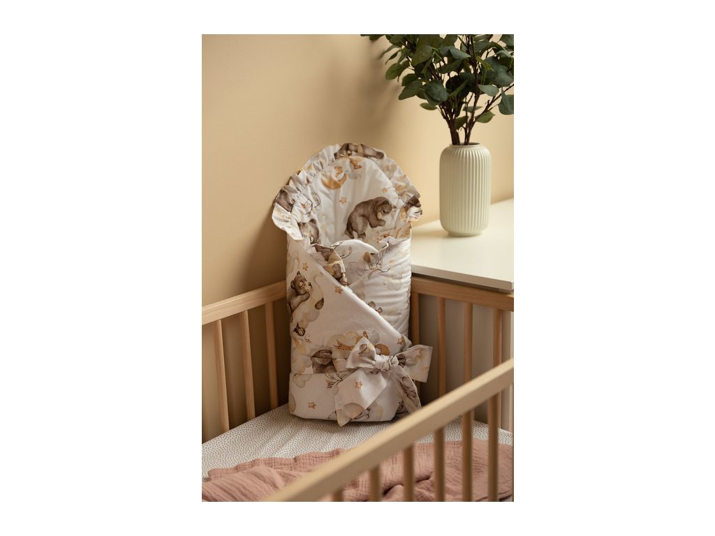 Oboustranné hnízdo s volánky bylo vytvořeno pro novorozence a děti. Poddanství Upevnění se širokou bavlněnou stuhou vám umožní pohodlně držet dítě během krmení a spánku. Po rozvinutí lze kužel úspěšně použít jako přikrývku pro dětskou postýlku nebo kočárek. Může být také použit jako hrací podložka. Je vyroben ze 100% bavlny. Výplň kužele je načechraná silikonová netkaná textilie. Závěr je vkusný kudrlinka.