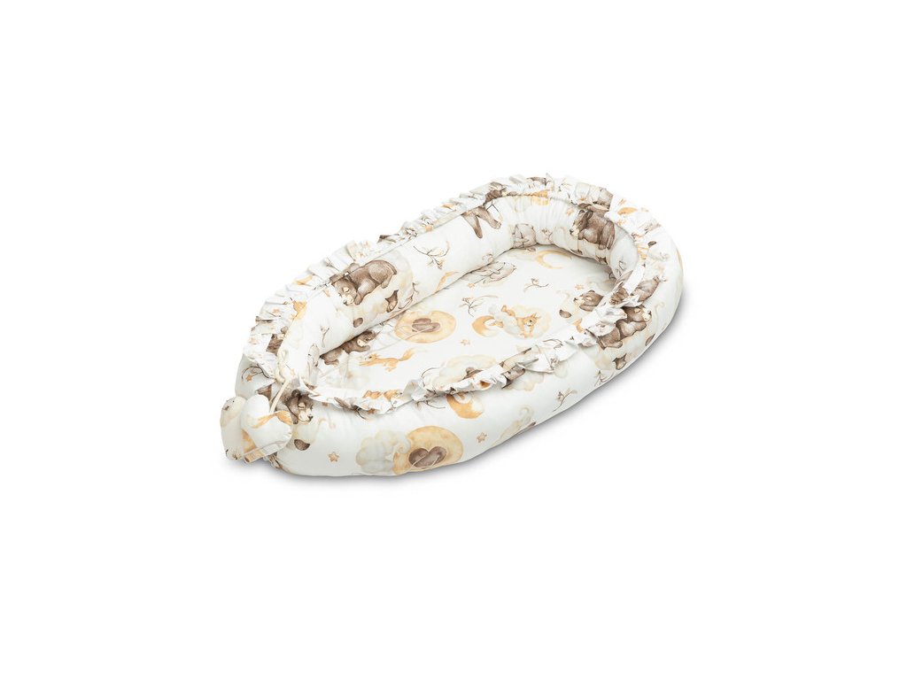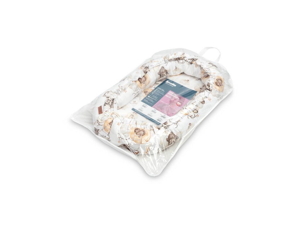 Kokon Velvet od Sensillo stworzony został z myślą o dzieciach od narodzin do ok. 6 miesiąca życia. Idealnie otula niemowlę i ogranicza mu przestrzeń, dzięki czemu dziecko czuje się bezpiecznie jak w brzuchu mamy. Wysokie ścianki zapobiegają sturlaniu się dziecka. Podłoże stanowi wyjmowany materacyk, który z jednej strony pokryty jest aksamitną tkaniną velvet a z drugiej delikatną 100% bawełną. Wypełnienie wałka stanowi antyalergiczne wypełnienie silikonowe.Sprawdzi się w wielu sytuacjach: w łóżku rodziców, na kanapie, w łóżeczku i podczas wyjazdów.